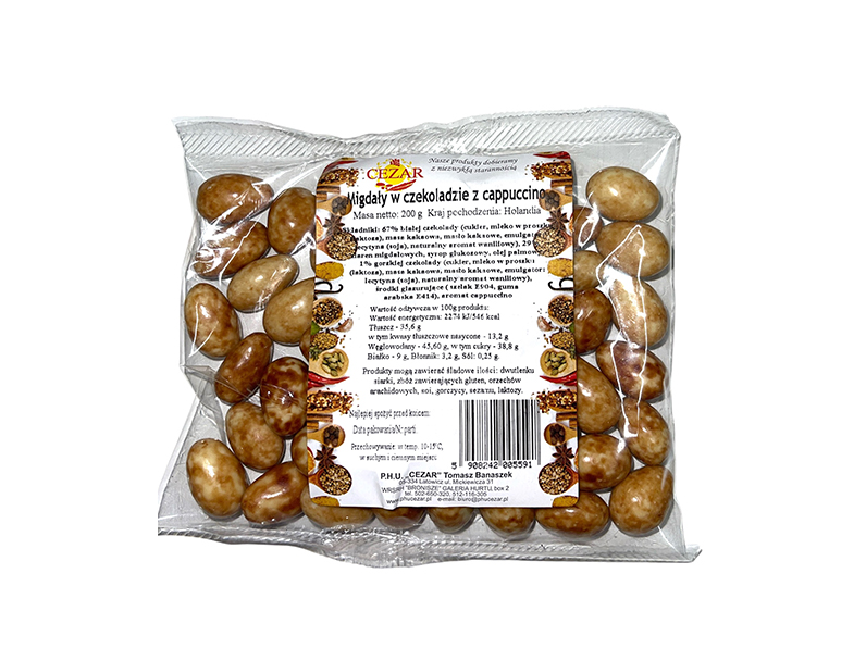 Pozwól sobie na chwilę relaksu z migdałami w białej i gorzkiej czekoladzie z dodatkiem aromatu cappuccino. Chrupiące ziarna migdałów otulone kremową czekoladą i delikatnym aromatem kawowym tworzą wyjątkową przekąskę – idealną do popołudniowej kawy, prezentu lub jako słodki dodatek do dnia.