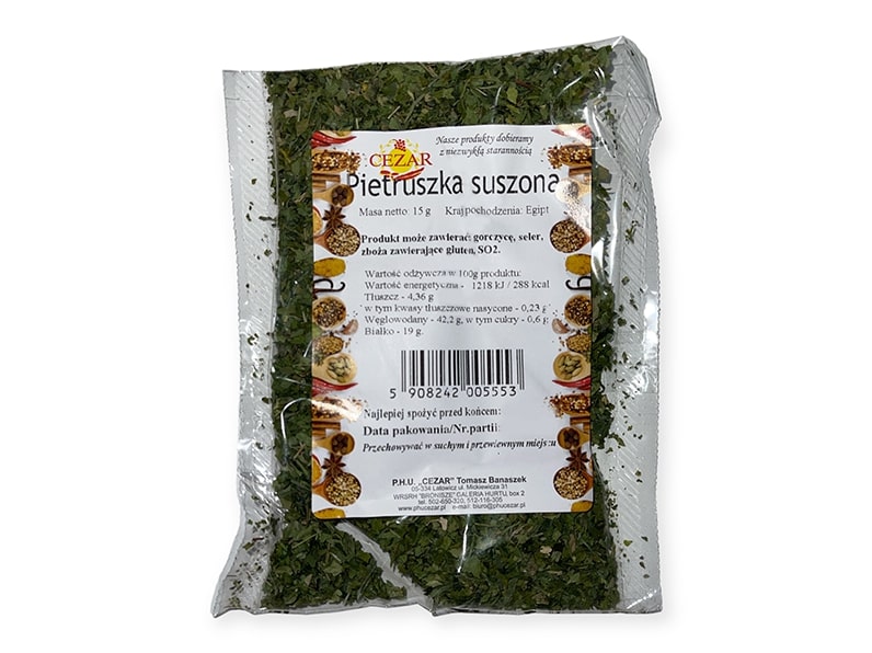 Pietruszka suszona to niezastąpiony dodatek do potraw, który wzbogaca smak i nadaje daniom świeżego, ziołowego aromatu. Idealna do zup, sosów, sałatek, dań mięsnych i warzywnych, a także jako ozdoba do talerza.